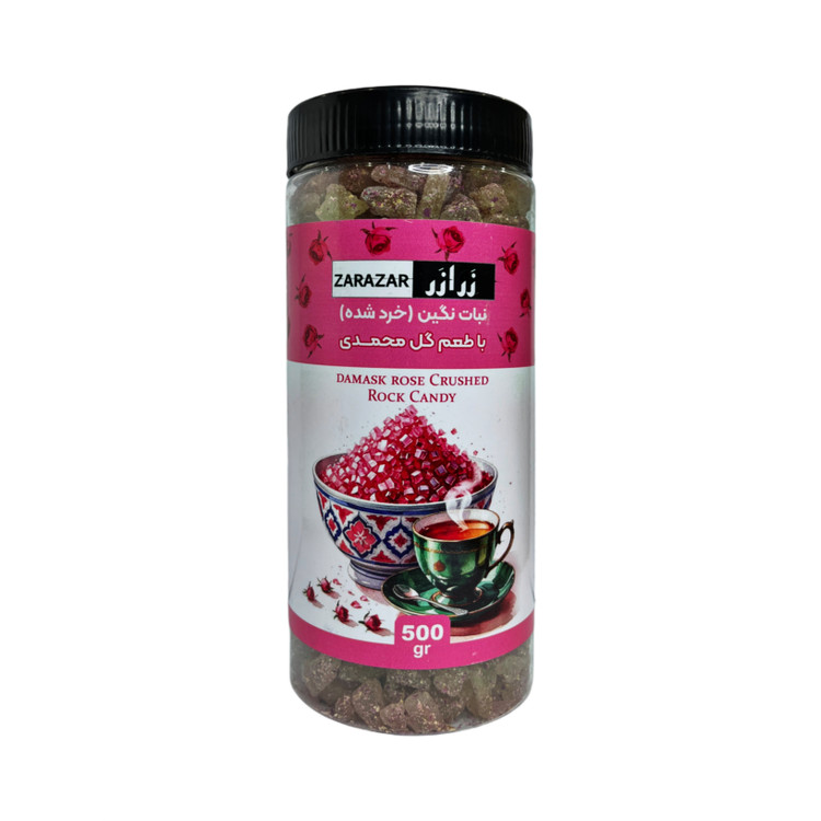 خرده نبات نگین گل محمدی زَرازَر از مرغوبترین نبات و گل محمدی کاشان تولید شده که با عطر بینظیر و طعم شیرین ملایم، بهترین انتخاب برای چای و دسرهای شماست!